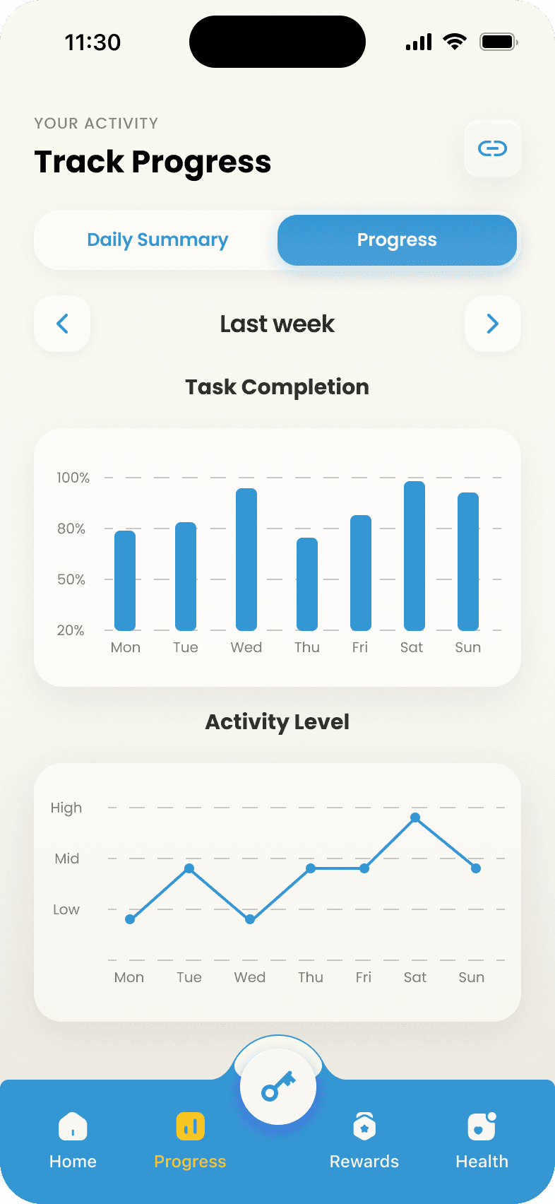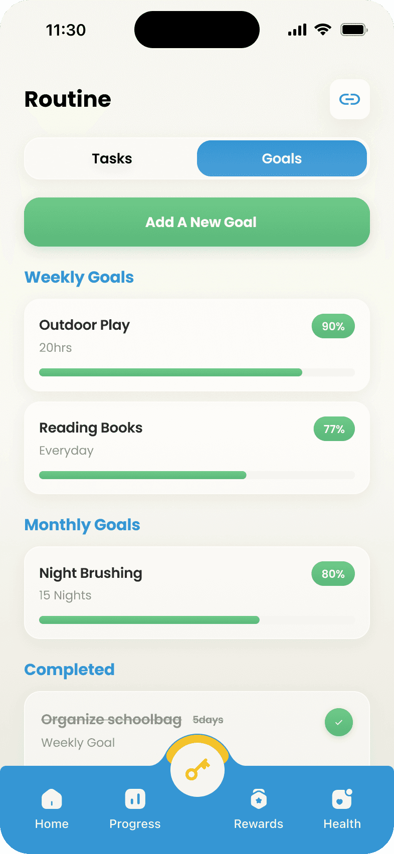 Habikey makes it easy to follow your child’s journey. View a detailed daily summary for today or any past date, and track weekly or monthly progress to spot patterns and improvements
