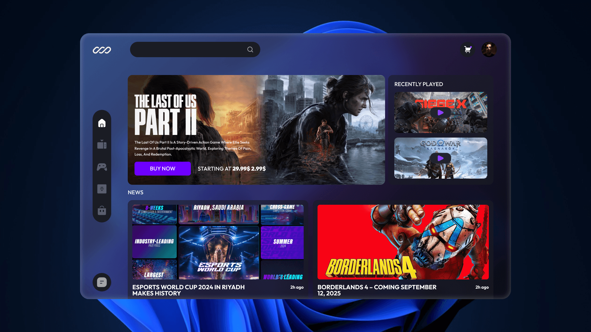 The Dashboard is the user’s central hub, showing featured game promotions, recently played titles, and the latest news. It’s designed for quick access and high engagement, with a dark, immersive theme.