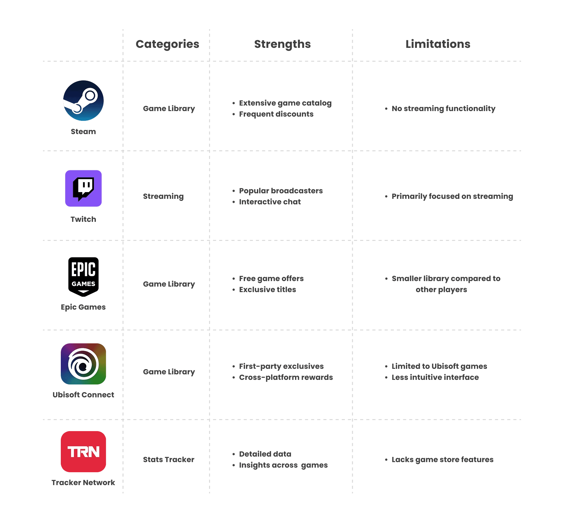 To better understand the landscape and position Linkplay effectively, I investigated various PC-based gaming platforms. This included tools for streaming, stat tracking, game purchasing, and social engagement. By comparing their core features and strengths, I aimed to identify both what users value most and where current solutions fall short. This analysis helped clarify Linkplay’s unique opportunity.