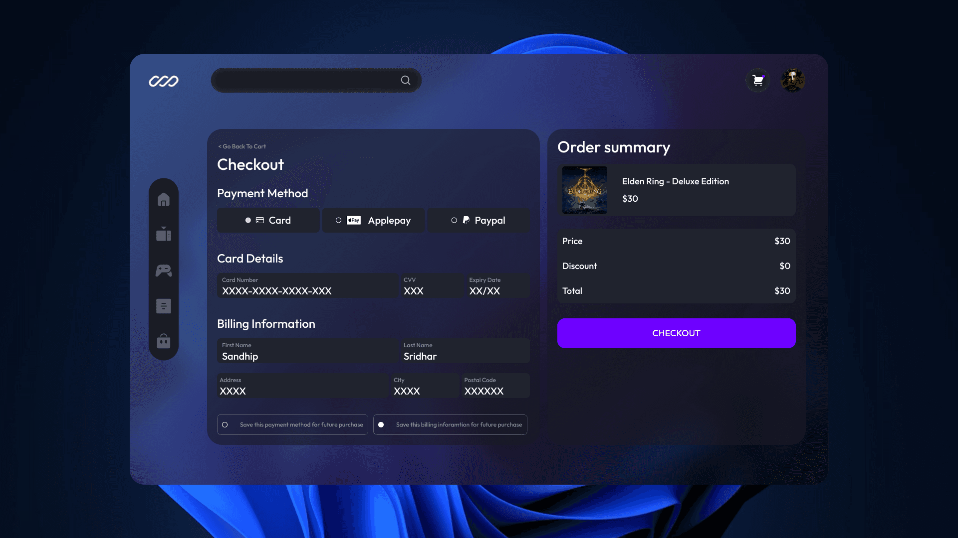 A smooth and simple flow to reviewuser's selected games, and to complete purchase securely. Designed for speed and clarity, so you can get back to playing fast.